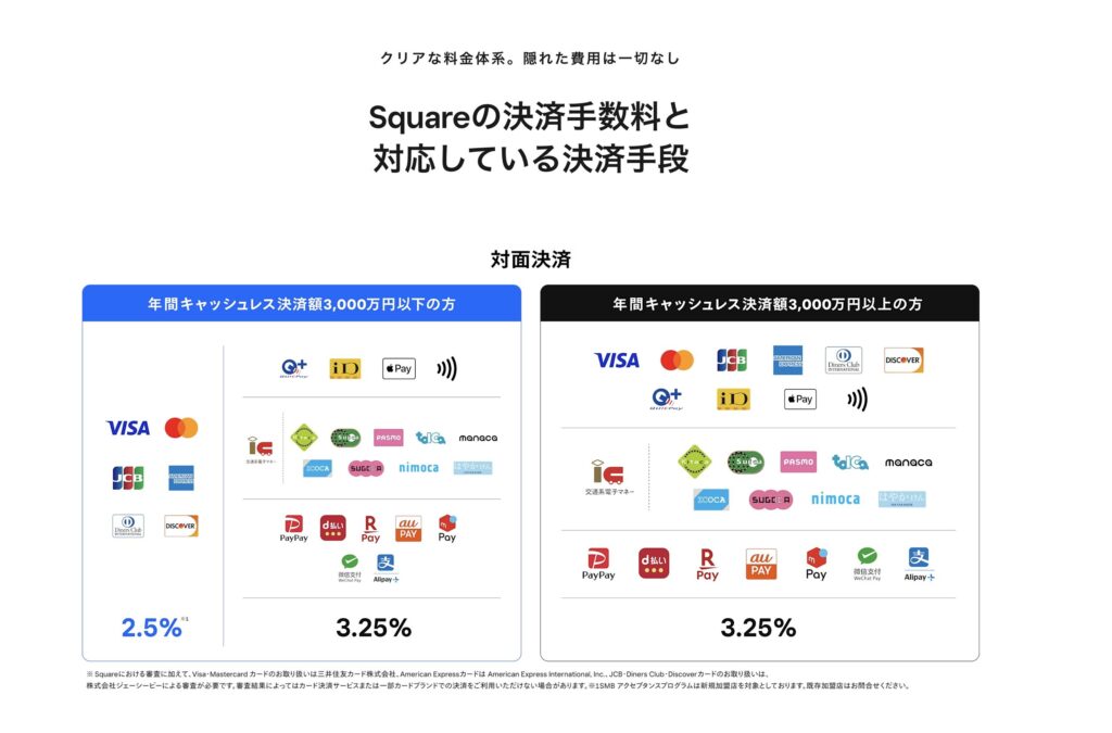 支払い​方法ごとの​所定の​手数料以外に​隠れた​費用は​一切​ありません。​Squareで​かかる​費用は、​決済時の​手数料のみです。